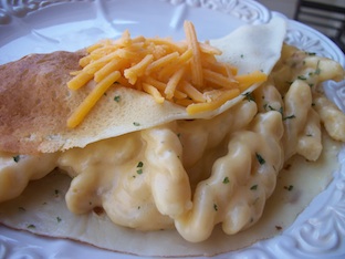 Assemble crepes: Lay first crepe across serving platter. Ladle ½ cup of macaroni and cheese across half the crepe. Fold in half and dust with extra cheese and dried parsley. Repeat with remaining crepes and serve immediately.